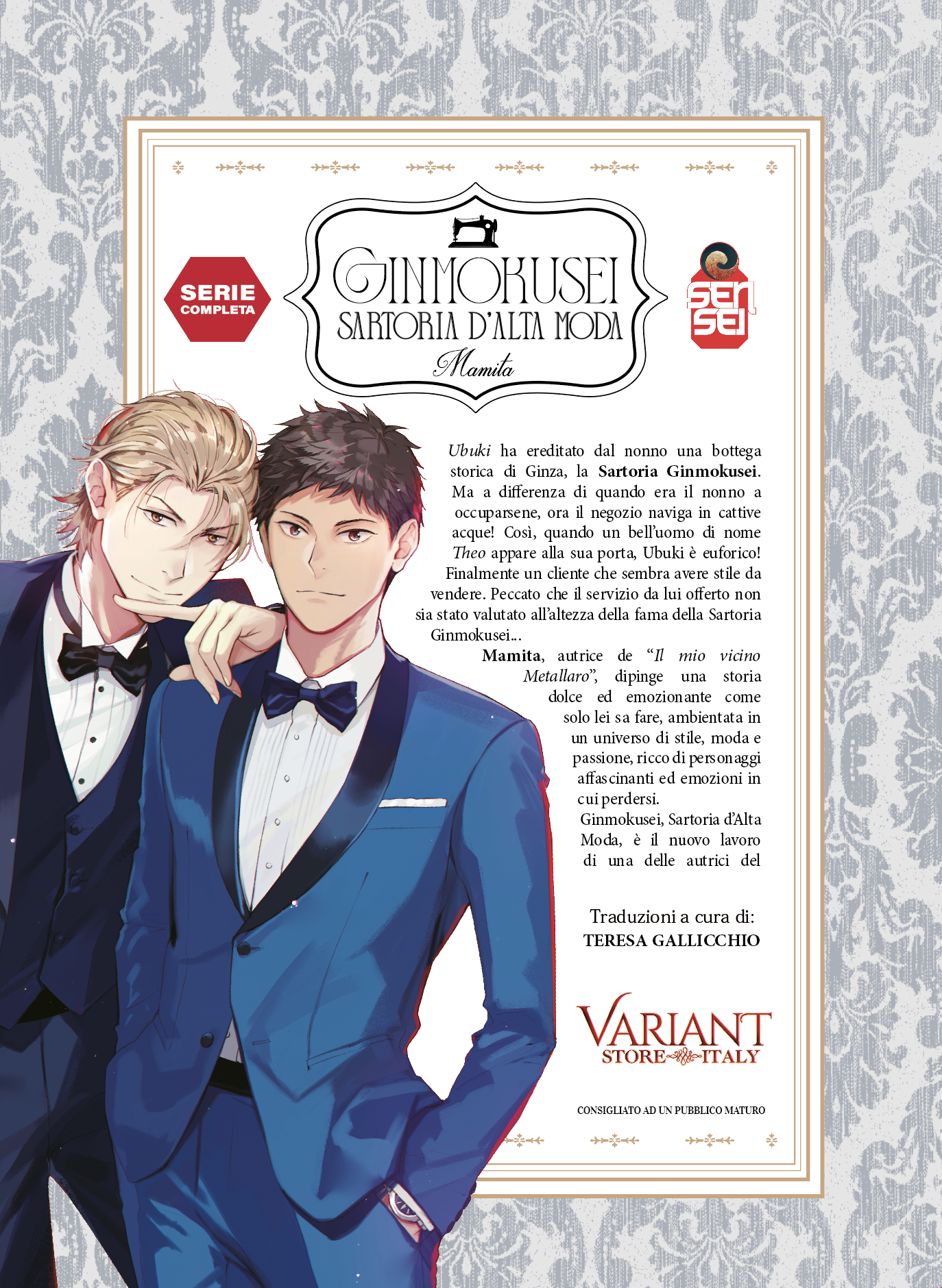 (Ginmokusei no Shitetaya) di Mamita ISBN:979-12-80795-82-3 ESCLUSIVA MANGASENPAI.IT - VARIANT STORE ITALIA Reperibile solo sul nostro sito e, fino ad esaurimento scorte, alla fiera di Lucca Comics 2024 e successive. Formato/Foliazione: Brossurato con sovracoperta, 400 pagine, Edizione di pregio con dettagli e fregi in filigrana dorata ed un set abbinato di 3 stupende cartoline a turatura limitata prezzo: 15,80 euro Editore originale: Tokuma-Shoten Uscita prevista: 1/11/2024 Sinossi: Ubuki eredita Ginmokusei, la sartoria del nonno alla periferia di Tokyo. Ma, al contrario dei tempi quando il nonno era al comando, Ginmokusei è ora in declino, nonostante tuti gli sforzi (poco raffinati) di Ubuki. Mentre i giorni passano senza l’ombra di un cliente, Ubuki diventa sempre più impaziente. Poi, un giorno, un uomo di nome Theo si presenta nella sartoria dichiarando: “Renderò quest’attività di prima categoria, quindi punta su di me!” Riuscirà Ubuki, con l’aiuto di Theo, a capovolgere la pessima situazione della sua sartoria? Dall’apprezzata sensei Mamita arriva una matura e adulta storia d’amore tra due uomini in… completi eleganti!